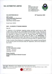 SAL – Closure of Trading Window – 30 Sep 2025