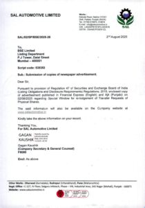 SAL-Newspaper Intimation for pecial Window for Re-Lodgement of Transfer Request of Physical Shares